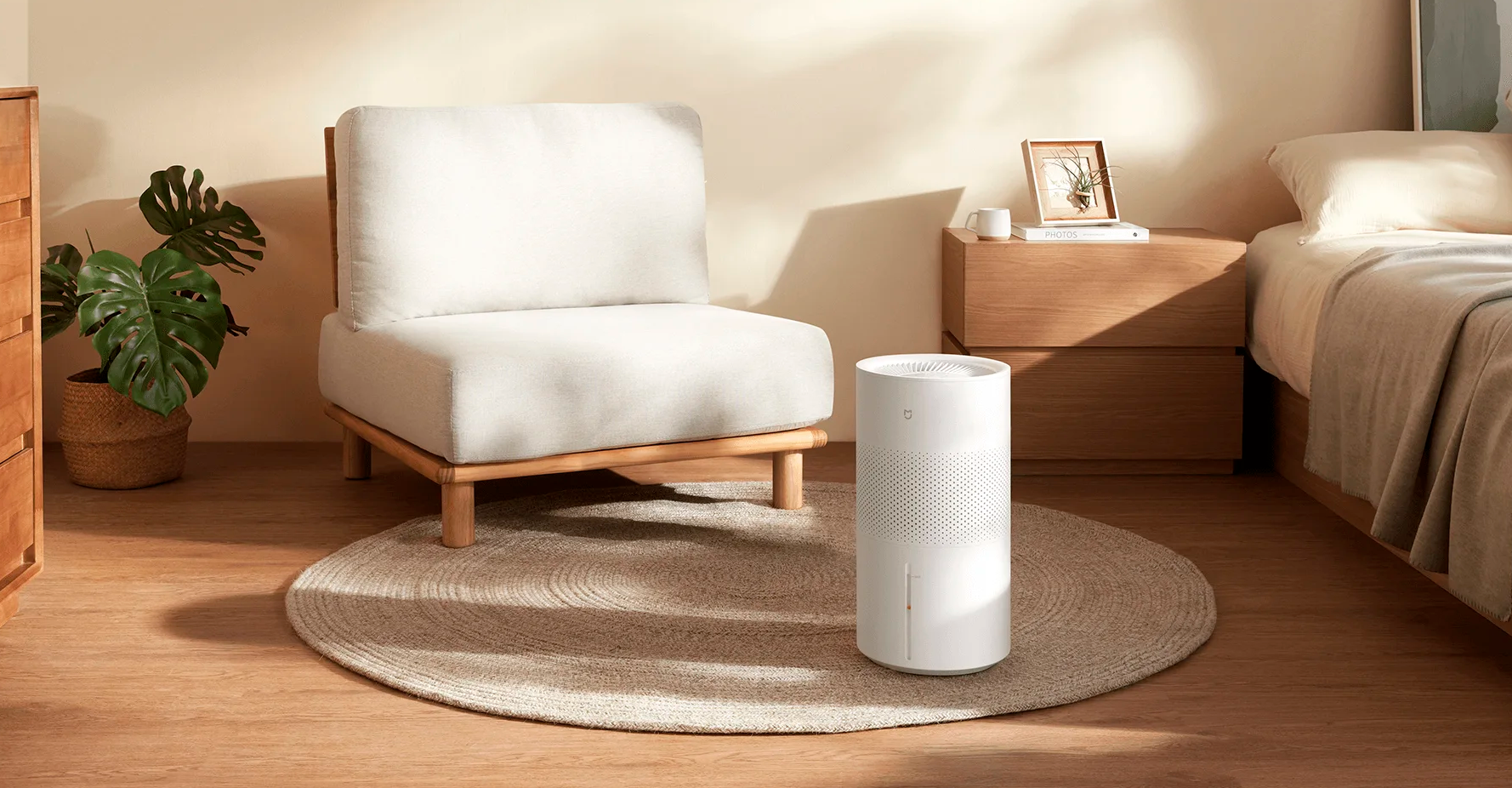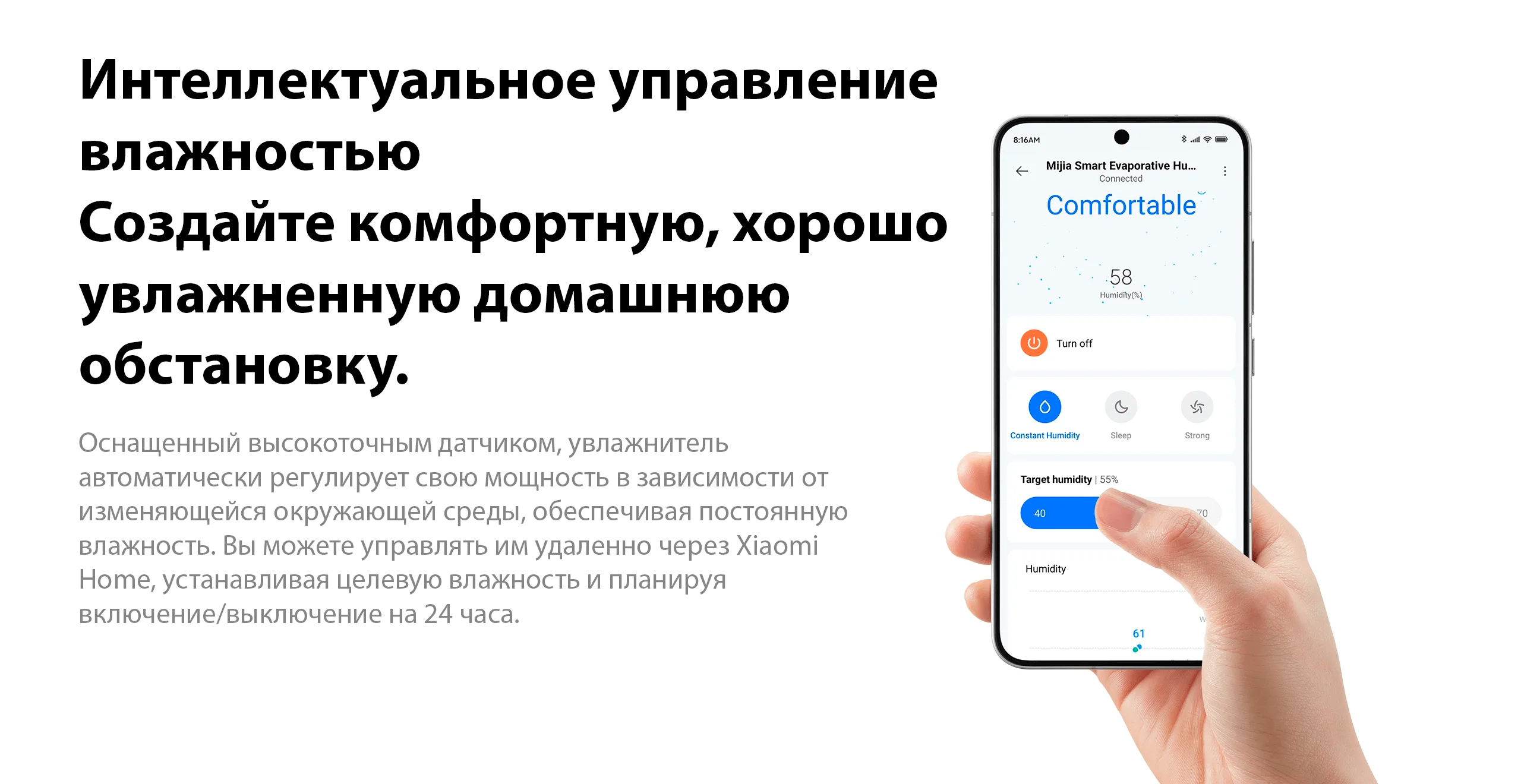Модель оснащена гигростатом и поддерживает автоматический и ручной режимы работы. Доступно сенсорное и электронное управление, а также контроль через приложение Mi Home и голосового помощника. Есть таймер, регулировка скорости вентилятора и автоматическое отключение при отсутствии воды.